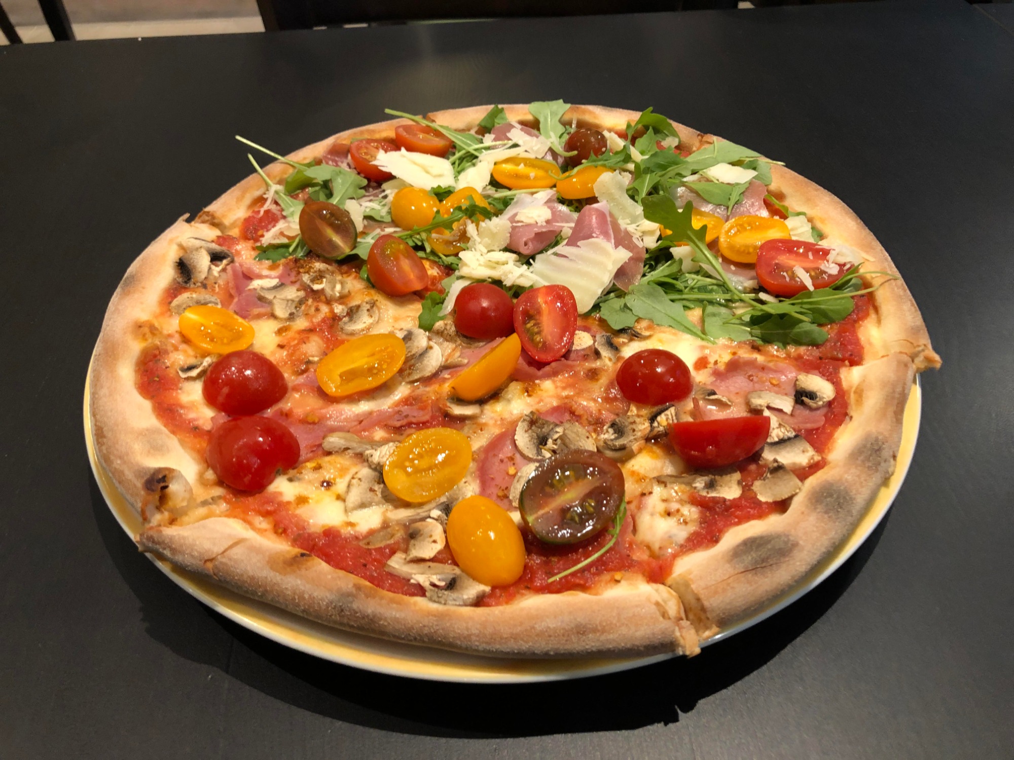 sos pomidorowy, mozzarella fior di latte, rukola, pomidorki cherry, szynka włoska speck -